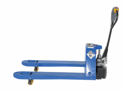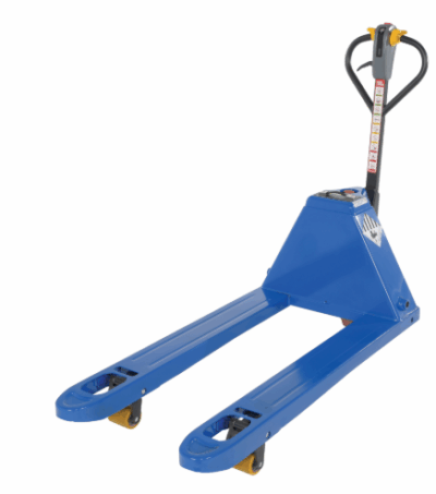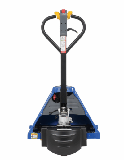 A semi electric pallet truck is the perfect combination of electric mobility and manual lifting. The battery powered design minimizes the manual labor associated with transferring heavy loads, while the manual hand pump gives the user control of the fork height. An open design provides access to all aspects of the truck for simple maintenance and cleaning purposes. The included lithium ion battery delivers a long life and countless charges. Bench top charger 24V/115Ah is included with unit. Powder coated blue finish. Horn included.
