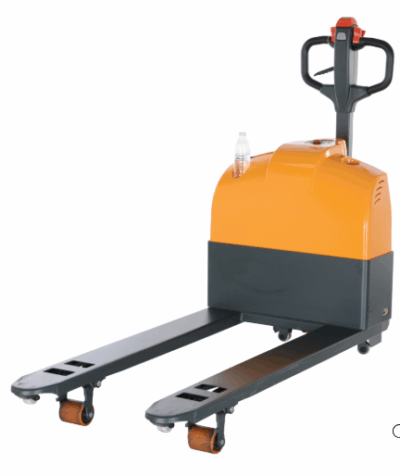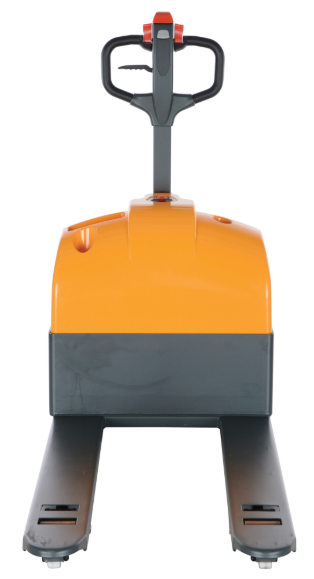 The EPT-S-2748-33 semi-electric pallet truck combines manual lift with DC-powered drive for easy load movement, featuring throttle controls, emergency stop, horn, and battery level gauge.